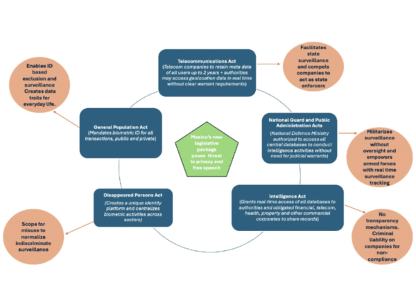 These new laws — fast-tracked through Congress — include amendments to Mexico’s Telecommunications Act, Intelligence Act, and other key legislation. Together, they establish a centralized surveillance infrastructure that mandates biometric identification for mobile users, enables real-time government access to public and private databases, and compels private sector compliance with surveillance demands without adequate safeguards.