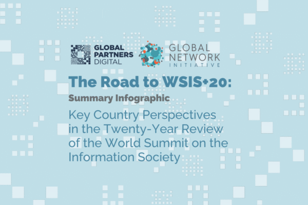 The Global Network Initiative (GNI) and Global Partners Digital (GPD) have published a new summary infographic presenting key country perspectives from the report, The Road to WSIS+20: Key Country Perspectives in the Twenty-Year Review of the World Summit on the Information Society. This work is part of the Shaping the WSIS+20 Review for a Unified Internet Multistakeholderism (SWIUM) project, supported by the inaugural ICANN Grant Program.