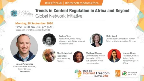 On September 28, GNI hosted a session on “Trends in Content Regulation in Africa and Beyond” as part of the Forum on Internet Freedom in Africa (FIFAfrica). Speakers from business, civil society, and academia shared their insights on current approaches to content regulation in various countries in Africa, identifying issues and possible multistakeholder solutions. This session built upon a series of consultations on content regulation around the world, including events focused on regulatory proposals in the EU, Pakistan, India, and the UK.